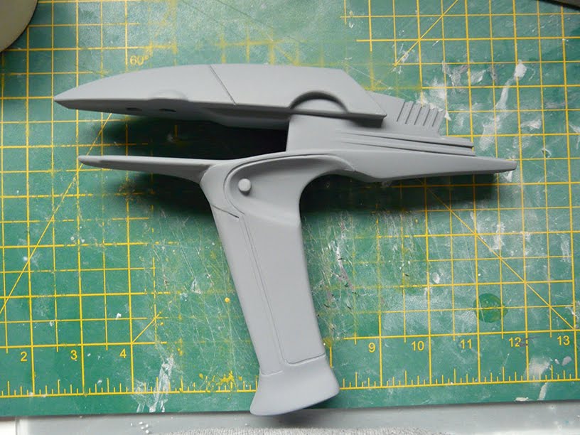 The next challenge was finding a decent gold paint. There are a lot of options here but it’s difficult to be certain of the final outcome until you have paid for the paint and sprayed something. I’ve had little joy with metallic paints in the past. My Klingon Bat’leth was sprayed with a metallic spray (the name and manufacturer I’ve forgotten now, sorry) that looked like real metal when it was finished but took about 6 months to harden by which time the blade had all sorts of scuffs on it. Just wrapping it in cloth for transport would blemish the surface!